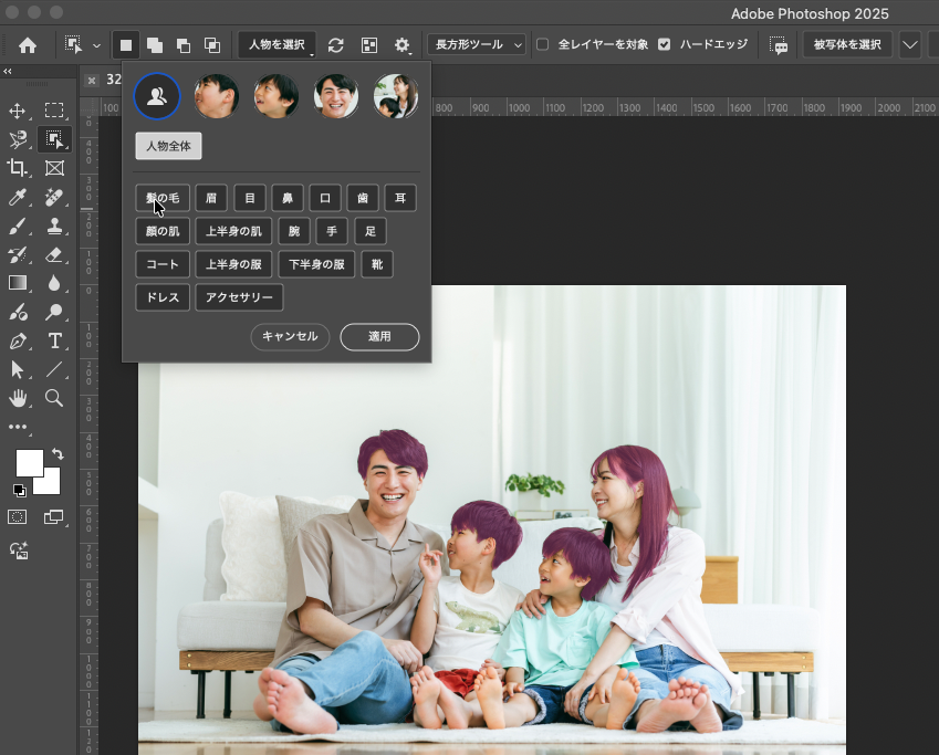Photoshopの新しい機能で、これまでの人物の自動選択機能に加えて、人物ごとに判別されてアイコン表示がされるようになりました。また、目、髪、服といったパーツごとの選択も可能になりました。